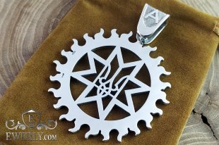 The photo shows a two-sided pendant-pendant made of sterling silver. "Tree of Life" is located on one side and a wolf on the other side. Amulet around his neck.